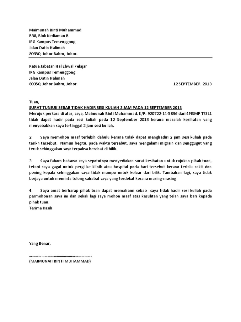 Surat rasmi tidak hadir kerja kerana sakit kepala surat rasmi tidak hadir kerja kerana sakit perut surat rasmi tidak hadir kerja kerana sakit sa surat rasmi tidak hadir kuliah surat rasmi tidak hadir kerja contoh surat rasmi tidak hadir sekolah contoh surat rasmi tidak hadir mesyuarat surat rasmi tidak hadir bekerja contoh surat rasmi tidak hadir sekolah